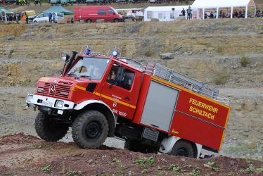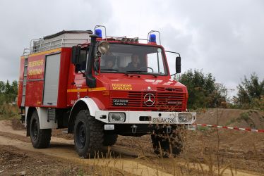 Die Schiltacher Feuerwehrmänner nutzen das Treffen, um Fahrpraxis und ein Gefühl für ihr eigenes Fahrzeug zu erhalten. Denn der Unimog, ein sogenannter Schlauchwagen, ist dafür vorgesehen, im Einsatzfall eine bis zu einem Kilometer lange Wasserleitung in freiem Gelände verlegen zu können. Und hier ist es wichtig, sein Fahrzeug zu kennen. Außerdem ist eine 180 kg schwere, tragbare Pumpe verladen, um bei der Wasserförderung für ausreichend Druck zu sorgen. Alles zusammen wiegt das Fahrzeug knapp 7,5 Tonnen und kann mit dem alten 3er-Führerschein gefahren werden. Jüngere Feuerwehrmänner dürfen mit ihrem B-Führerschein und einer Zusatzqualifikation das schwere Gefährt bewegen.