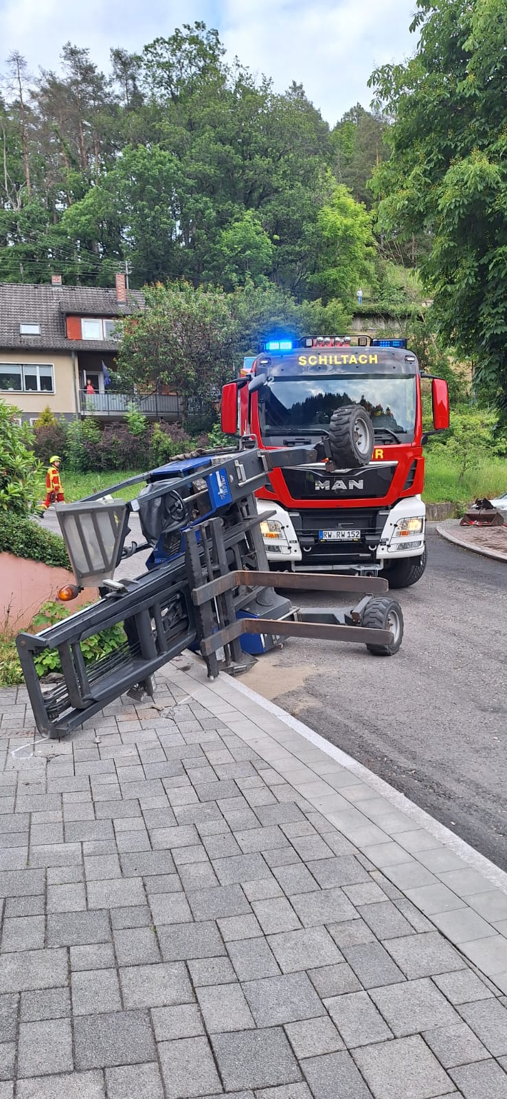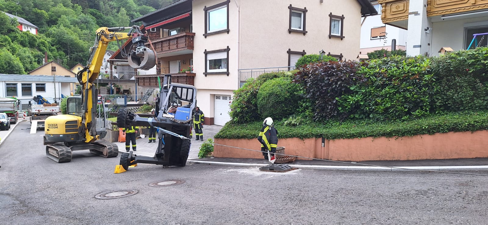 Nach einer guten halben Stunde konnte der Stapler – angeleint von der Winde der Feuerwehr Schiltach und angehoben vom Bagger – aufgerichtet und abgestellt werden.