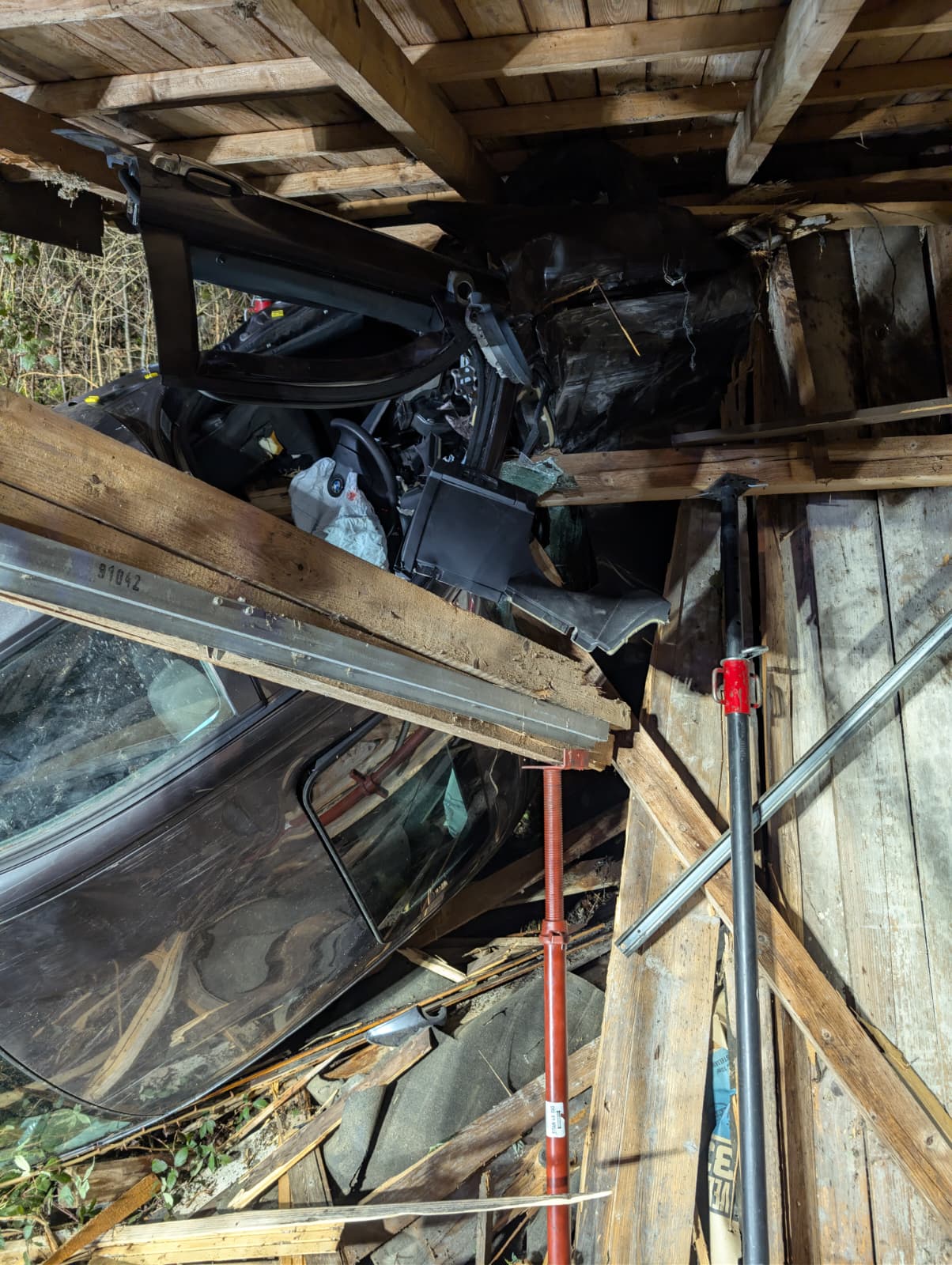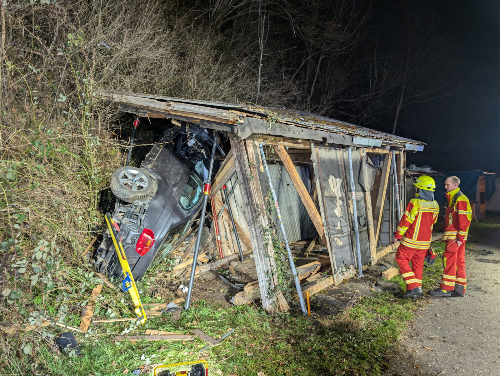 Ein Pkw hatte sich überschlagen und war in einen Holzschopf, in einen Schuppen gefahren. Dabei bohrte sich ein Balken der Hütte in die Windschutzscheibe des Fahrzeugs – der junge Fahrer des BMW hatte offenbar großes Glück, dass er dabei nicht schwerer verletzt wurde. Er war zunächst in seinem Fahrzeug eingeklemmt und musste von der Feuerwehr mit hydraulischem Rettungsgerät befreit werden.