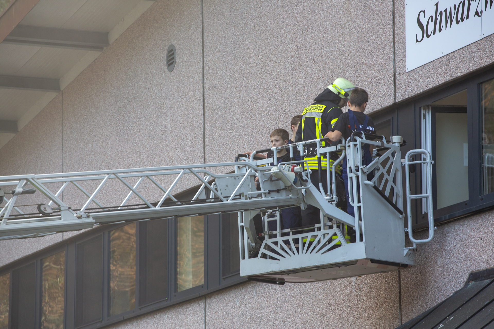Als die Feuerwehr nach der Alarmierung durch die Leitstelle am Übungsobjekt eintrifft, schreien die unverletzten Jugendlichen aus dem Fenster im Obergeschoss um Hilfe.