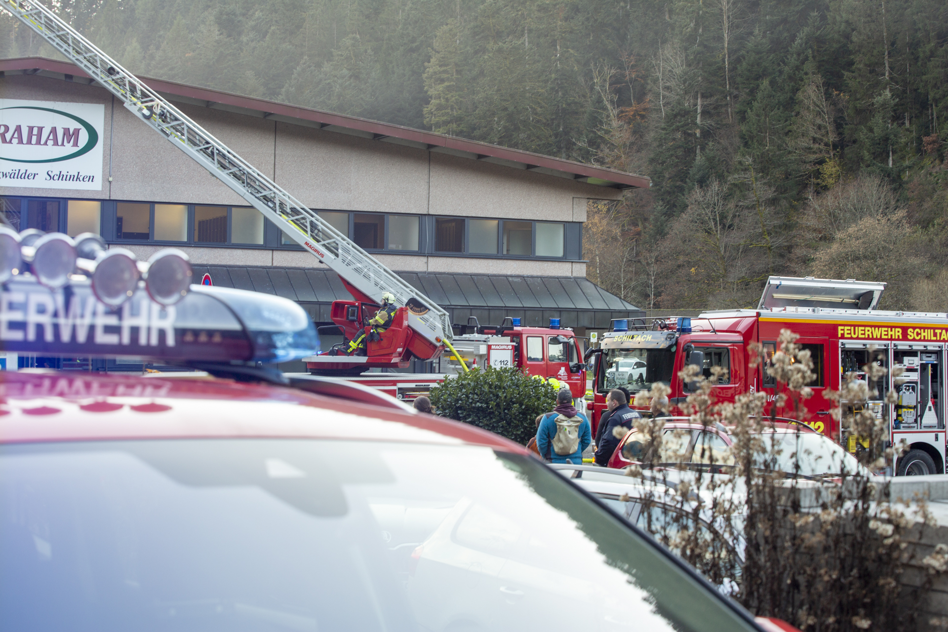 Dies erforderte ein Großaufgebot an Einsatzkräften und Fahrzeugen. Am Samstagnachmittag qualmt es sichtbar aus dem Firmengebäude von Bell Schwarzwälder Schinken im Bereich „Sommerwies“.