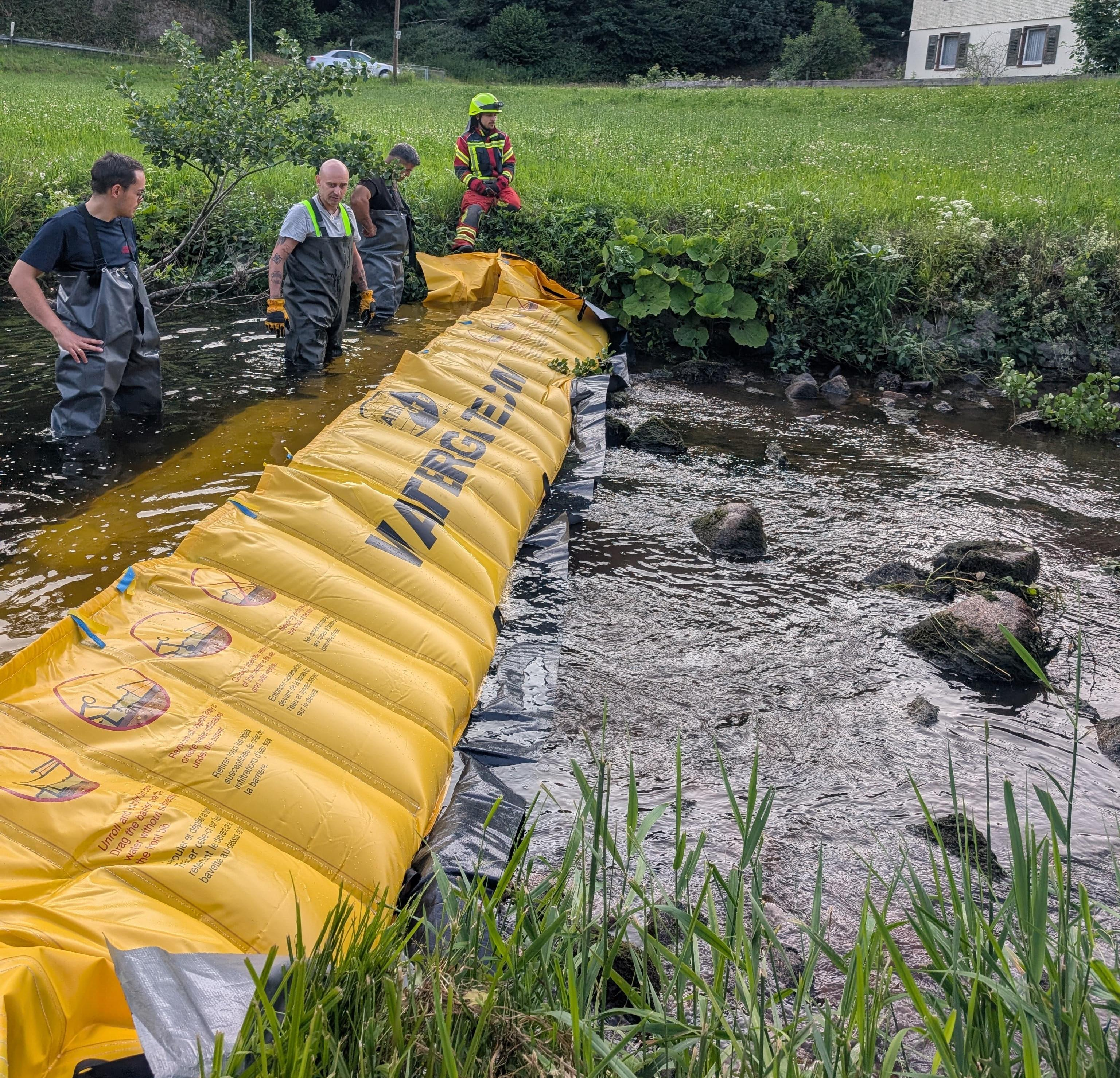 Diese Übungen finden meist in kleinen Gruppen statt. So haben alle Teilnehmenden die Möglichkeit, selbst mit der Ausrüstung zu arbeiten und praktische Erfahrung zu sammeln. Auch am vergangenen Montag stand wieder eine solche Einheit auf dem Plan: Geübt wurde der Aufbau des „Watergate“ – ein mobiler Staudamm, der in Bächen oder Flüssen wie der Kinzig oder Schiltach, aber auch in kleineren Seitengewässern eingesetzt werden kann. Er staut Wasser auf, das dann in der Nähe des Brandherdes mit Pumpen entnommen werden kann – selbst in trockenen Zeiten wie aktuell.