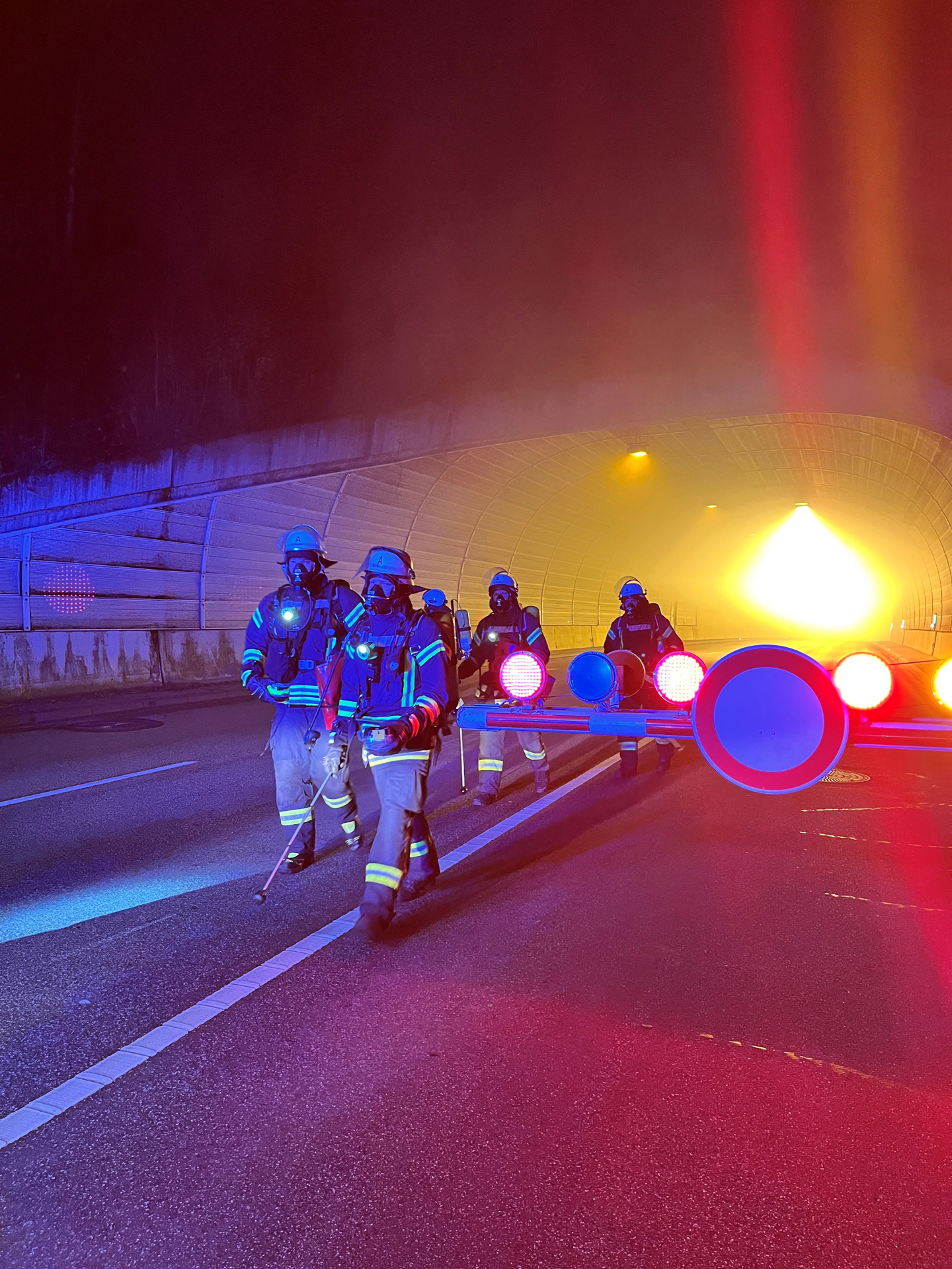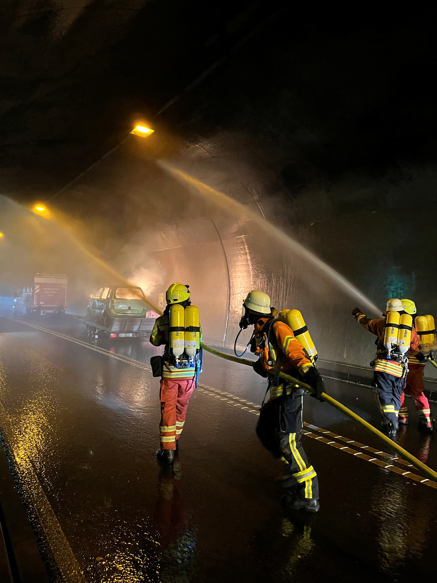 Auf der gegenüberliegenden Tunnelseite forderte eine zweite Station die Kräfte mit einem brennenden Kleinwagen. Neben dem Löscherfolg selbst spielten auch das Vorgehen und die Sicherheit eine wichtige Rolle: So muss in Tunnelröhren etwa die Tunneldecke über dem Brand gekühlt werden – damit wird verhindert, dass der Beton platzt und Trümmerteile auf die Einsatzkräfte stürzen.
